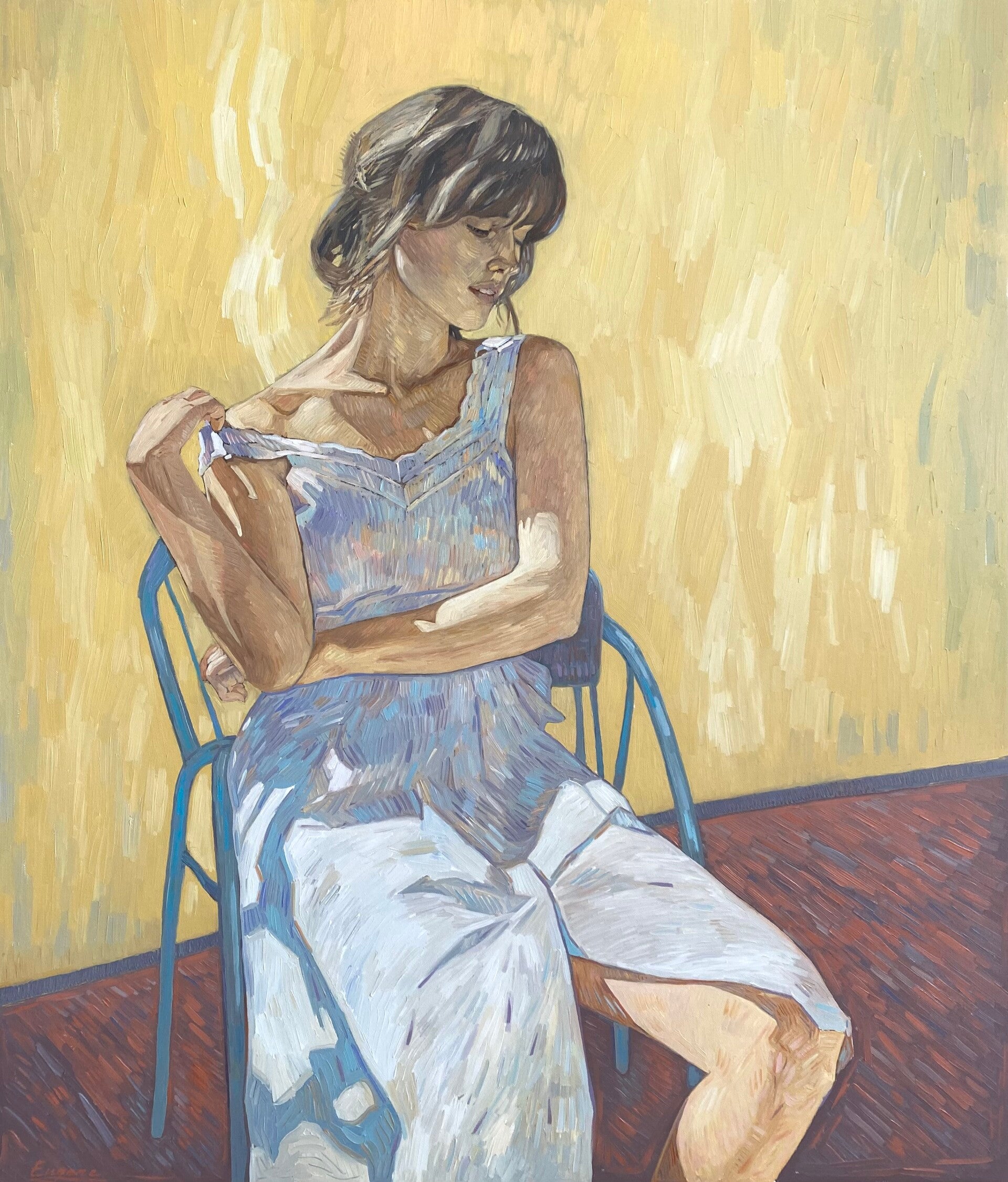 Beautiful woman sitting on a chair with a warm background.Here I wanted to convey lightness and at the same time emotional load on the viewer with the help of color and subtext. Impressionistic brushstrokes set the dynamics of the picture and should give your vision constant movement across the painting. Best looking in daylight.
